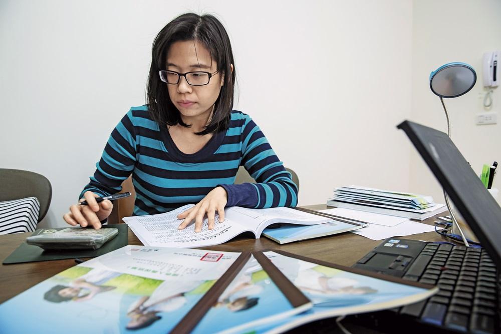 醫院待久了,對人生無常體悟越深,但省成精的蔡佾姿,面對繳費一繳20年,保費又動輒上萬元起跳的保單,怎麼可能輕忽大意。於是她花了至少2年時間潛心研究,下班再怎麼累,還是要上網比較各項商品內容,請教網友,交叉比對各項觀念,「我每條保單條款都一定會看,給付範圍一清二楚,保險業務員都跟我說,我根本可以去考業務員證照了。」蔡佾姿語氣洋溢幾分得意。